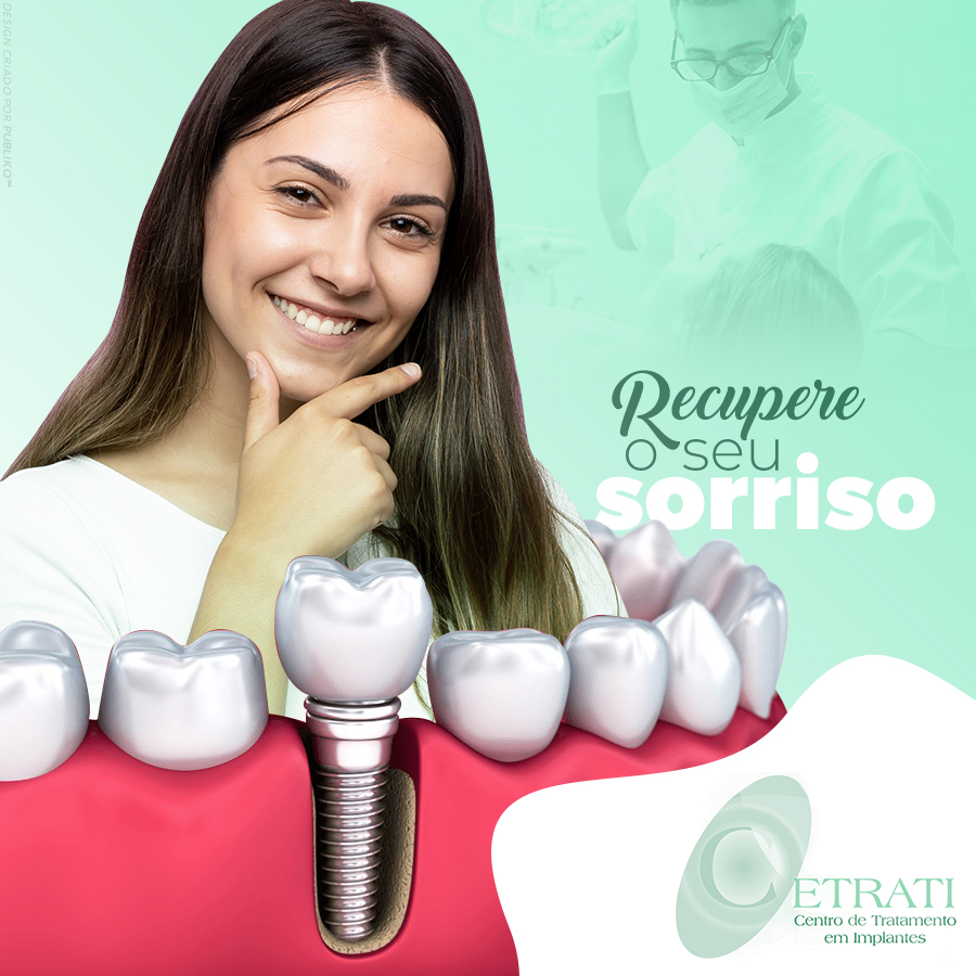 O Implante dentário é uma estrutura de titânio feita para substituir as raízes dentárias perdidas. Sobre ele é instalada uma prótese feita em resina ou porcelana que substitui o dente ausente.